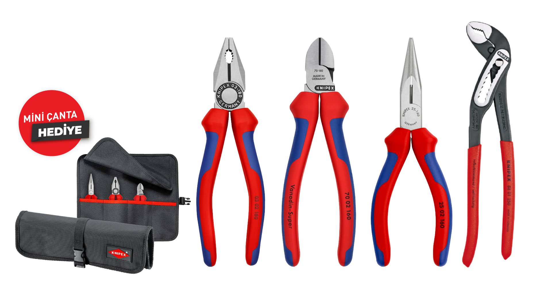 Teslimat kapsamı: 1 x 44 11 J2 KNIPEX Segman pensesi Delikler içindeki iç segmanlar için (Ø 19 - 60 mm), 1 x 44 21 J21 KNIPEX Segman pensesi Delikler içindeki iç segmanlar için (Ø 19 - 60 mm), 1 x 46 11 A2 KNIPEX Segman pensesi Millerdeki dış segman için (Ø 19 – 60 mm), 1 x 46 21 A21 KNIPEX Segman pensesi Millerdeki dış segman için (Ø 19 – 60 mm),