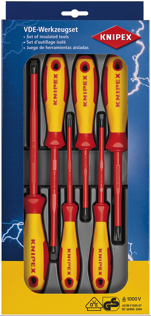 Self servis delikli şık satış ambalajı. Takımlar şeffaf kapaklı plastik vakum çekmeli ambalaj içindedir. Ölçüler (G x Y x D): 170 x 370 x 40 mm. Penseler DIN EN/IEC 60900 1000V normuna göre VDE onaylı, krom kaplamalı penseler; çok komponentli kılıflı saplar. self servis kart/kabartma.
