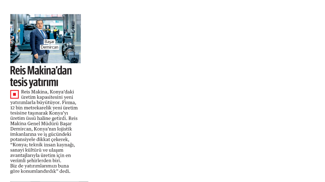 Sektöründeki liderliğini kararlılıkla sürdüren Reis Makina’nın, Konya’yı üretim üssü haline getiren 12 bin metrekarelik yeni tesis yatırımı, ulusal basında yankı buldu. Yeni Şafak Gazetesi, bu önemli gelişmeye Genel Müdürümüz Sayın Başar Demircan’ın detaylı açıklamalarının yer aldığı bir röportajla sayfalarında yer verdi.
