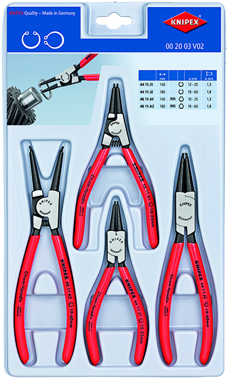 Teslimat kapsamı: 1 x 44 11 J1 KNIPEX Segman pensesi Delikler içindeki iç segmanlar için (Ø 12 - 25 mm), 1 x 44 11 J2 KNIPEX Segman pensesi Delikler içindeki iç segmanlar için (Ø 19 - 60 mm), 1 x 46 11 A1 KNIPEX Segman pensesi Millerdeki dış segman için (Ø 10 – 25 mm), 1 x 46 11 A2 KNIPEX Segman pensesi Millerdeki dış segman için (Ø 19 – 60 mm),
